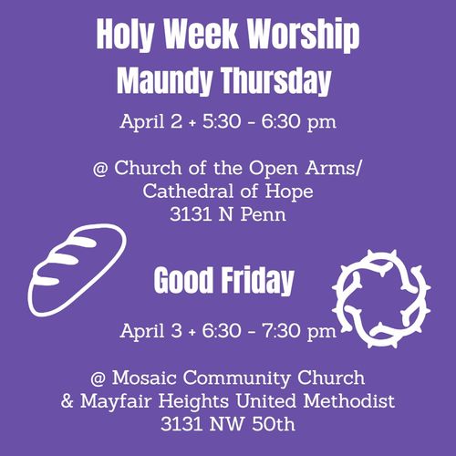 Our worship on Sundays is at 11 am in person or available on Facebook (facebook.com/mosaicokc) or YouTube (bit.ly/mosaicokcyoutube)