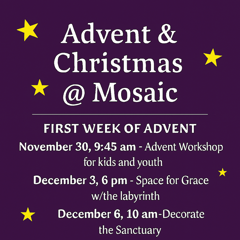 Our worship on Sundays is at 11 am in person or available on Facebook (facebook.com/mosaicokc) or YouTube (bit.ly/mosaicokcyoutube)